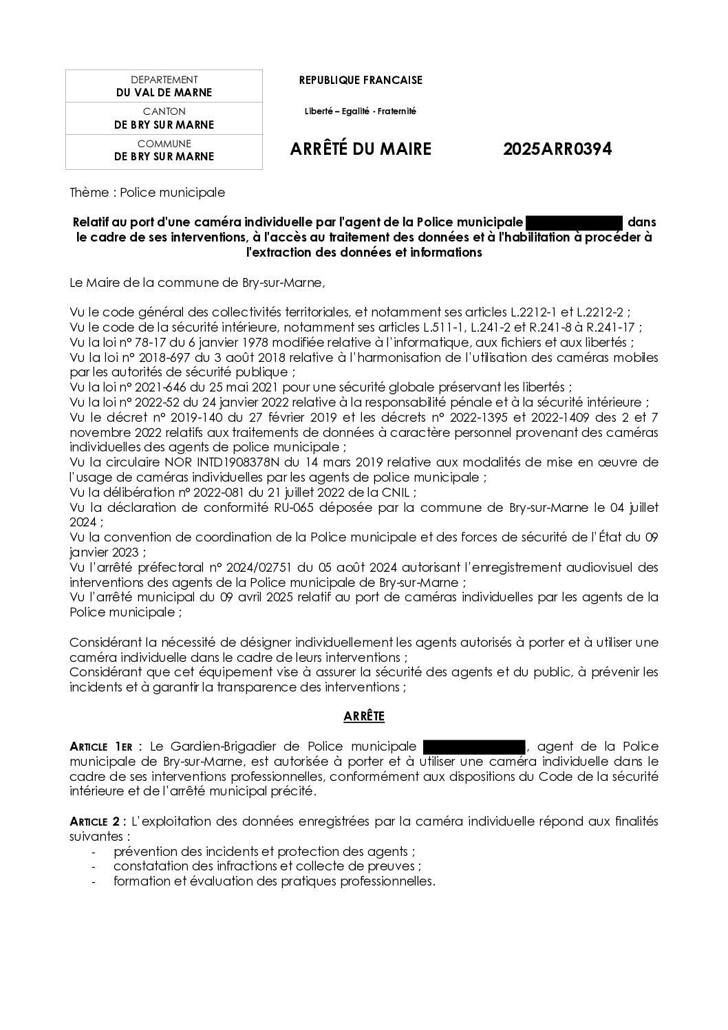 2025ARR0394 – Arrêté relatif au port d'une caméra individuelle par l'agent de la Police municipale dans le cadre de ses interventions, à l'accès au traitement des données et à l'habilitation à procéder à l'extraction des données et informations