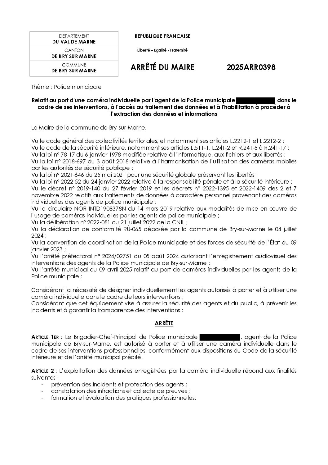2025ARR0398 – Arrêté relatif au port d'une caméra individuelle par l'agent de la Police municipale dans le cadre de ses interventions, à l'accès au traitement des données et à l'habilitation à procéder à l'extraction des données et informations