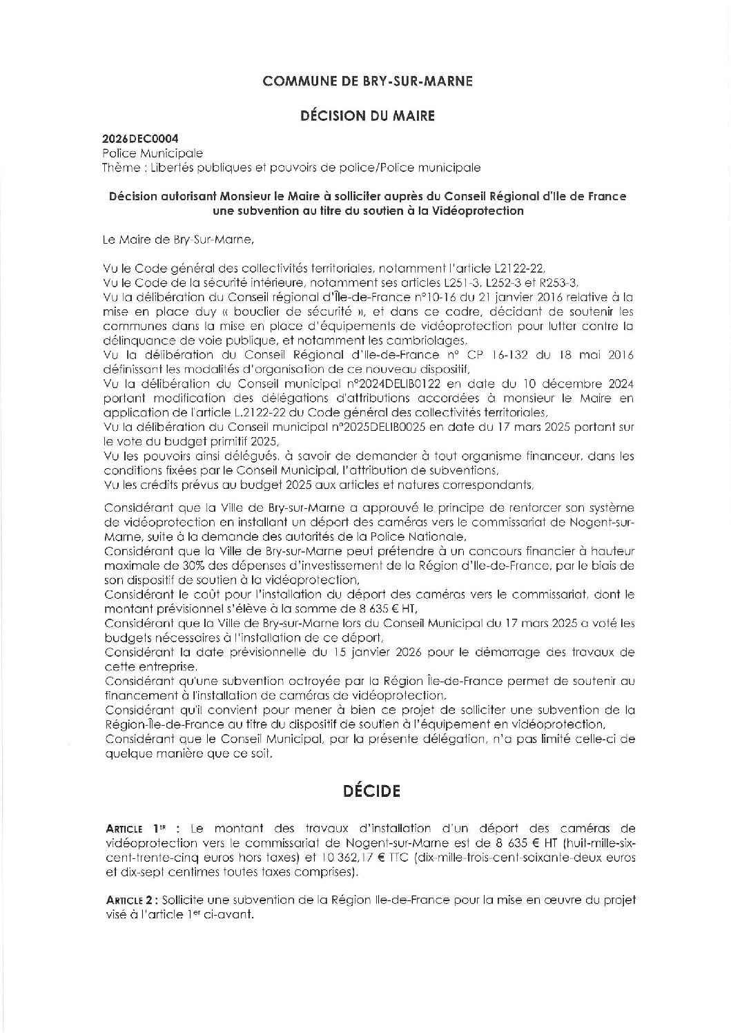 2026DEC0004 – Décision autorisant Monsieur le Maire à solliciter auprès du Conseil Régional d'Ile-de-France une subvention au titre du soutien à la Vidéoprotection