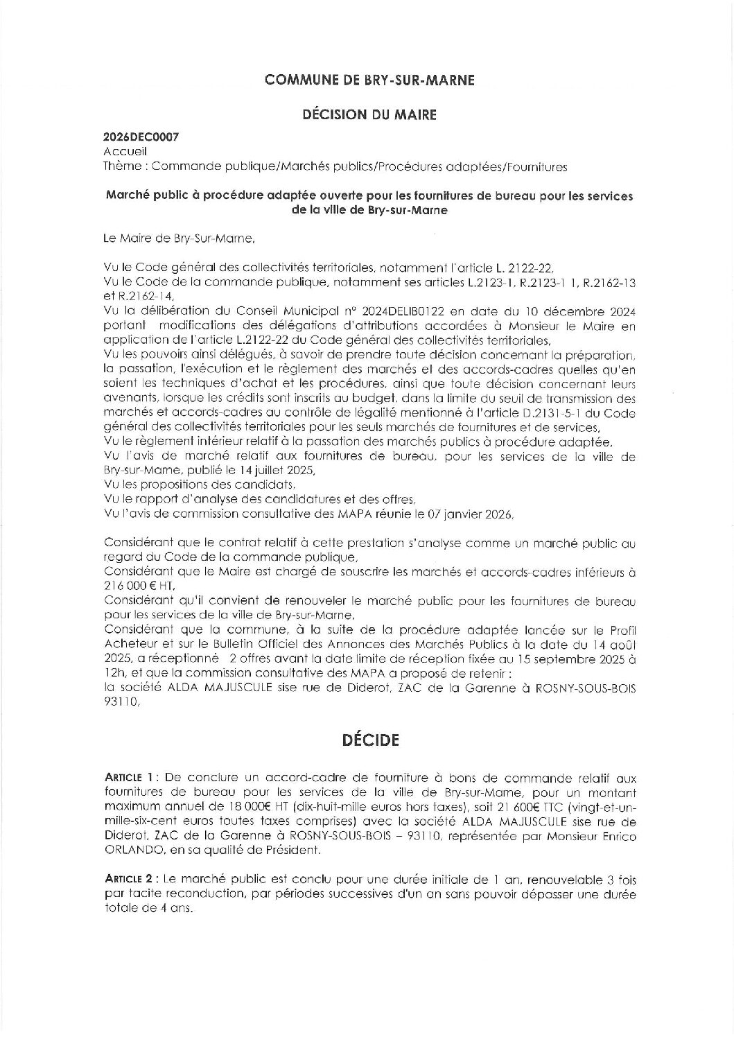 2026DEC0007 – Marché public à procédure adaptée ouverte pour les fournitures de bureau pour les services de la ville de Bry-sur-Marne