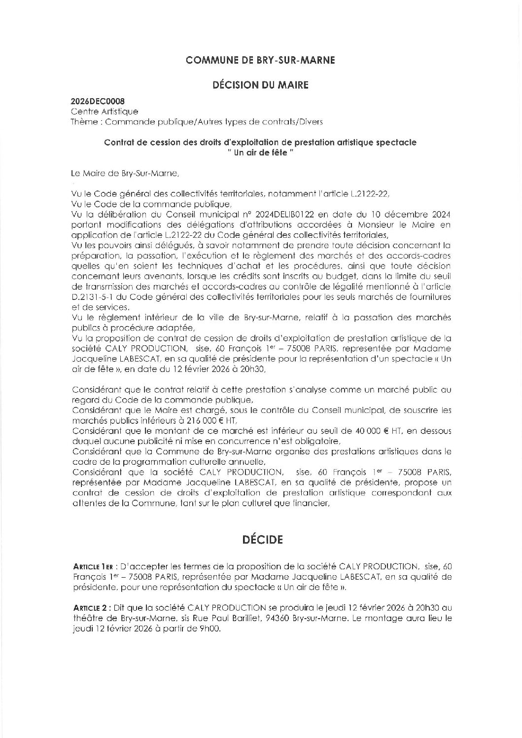 2026DEC0008 – Contrat de cession des droits d'exploitation de prestation artistique spectacle " Un air de fête "