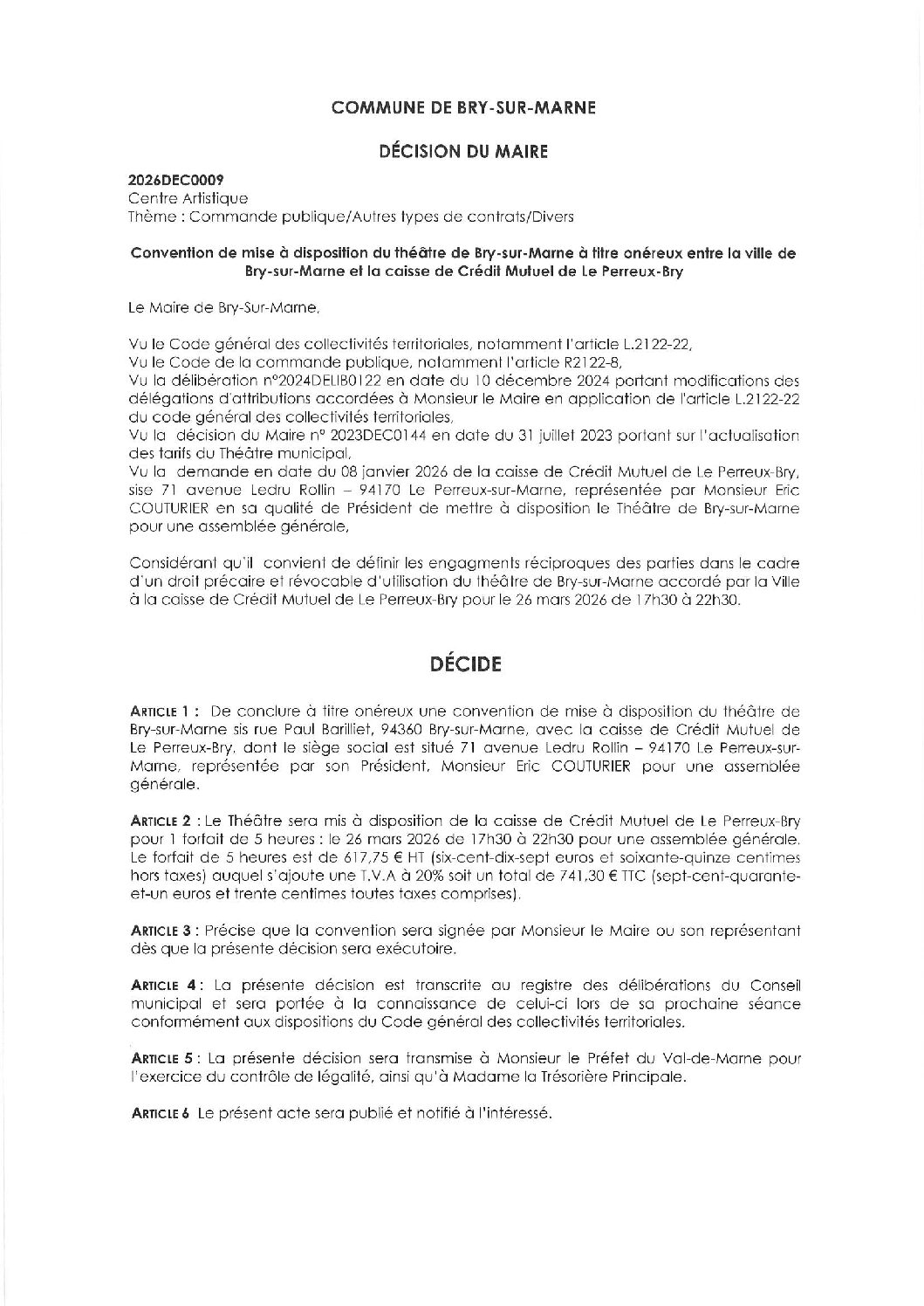 2026DEC0009 – Convention de mise à disposition du théâtre de Bry-sur-Marne à titre onéreux entre la ville de Bry-sur-Marne et la caisse de Crédit Mutuel Le Perreux-Bry