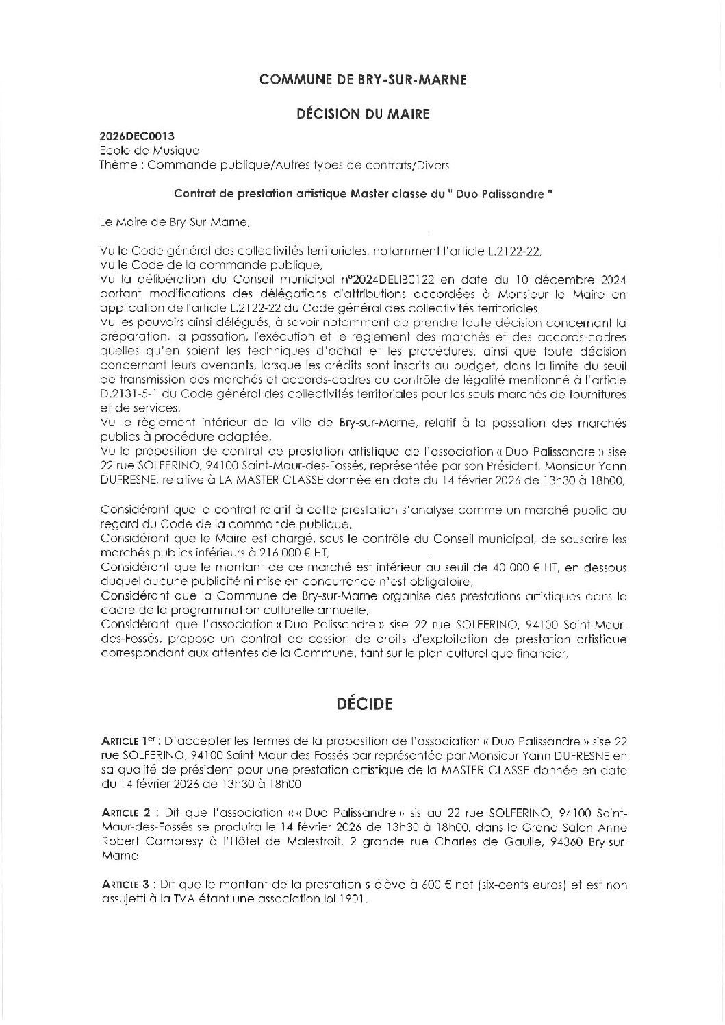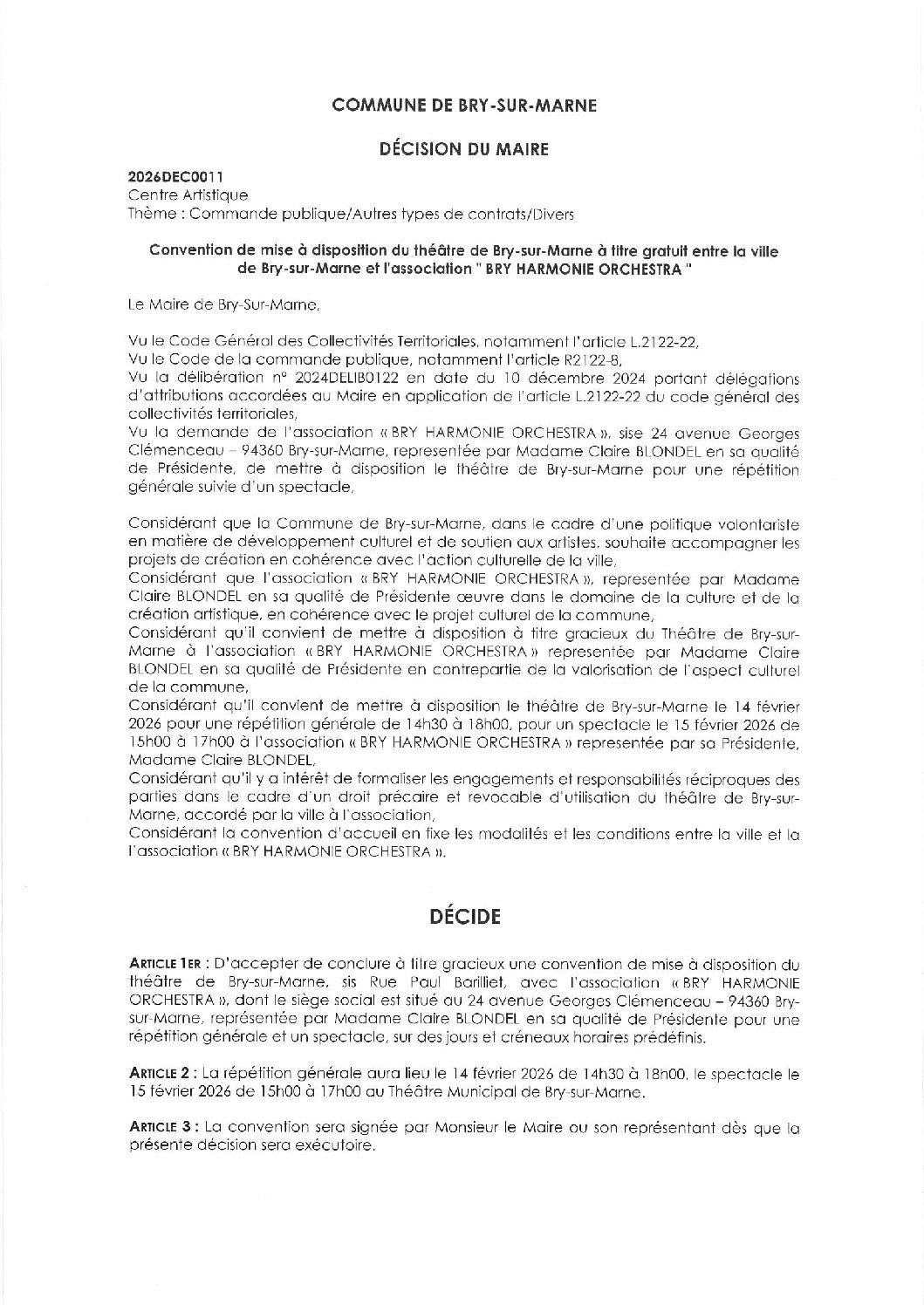 2026DEC0011 – Convention de mise à disposition du théâtre de Bry-sur-Marne à titre gratuit entre la ville de Bry-sur-Marne et l'association " BRY HARMONIE ORCHESTRA "