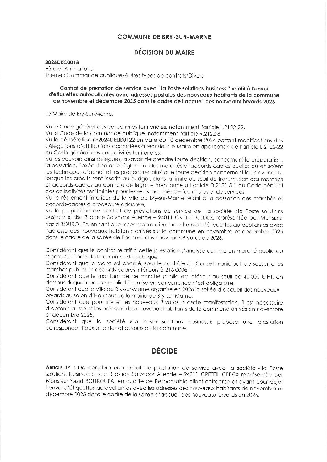 2026DEC0018 – Contrat de prestation de service avec " la Poste solutions business " relatif à l'envoi d'étiquettes autocollantes avec adresses postales des nouveaux habitants de la commune de novembre et décembre 2025 dans le cadre de l'accueil des nouveaux bryards 2026