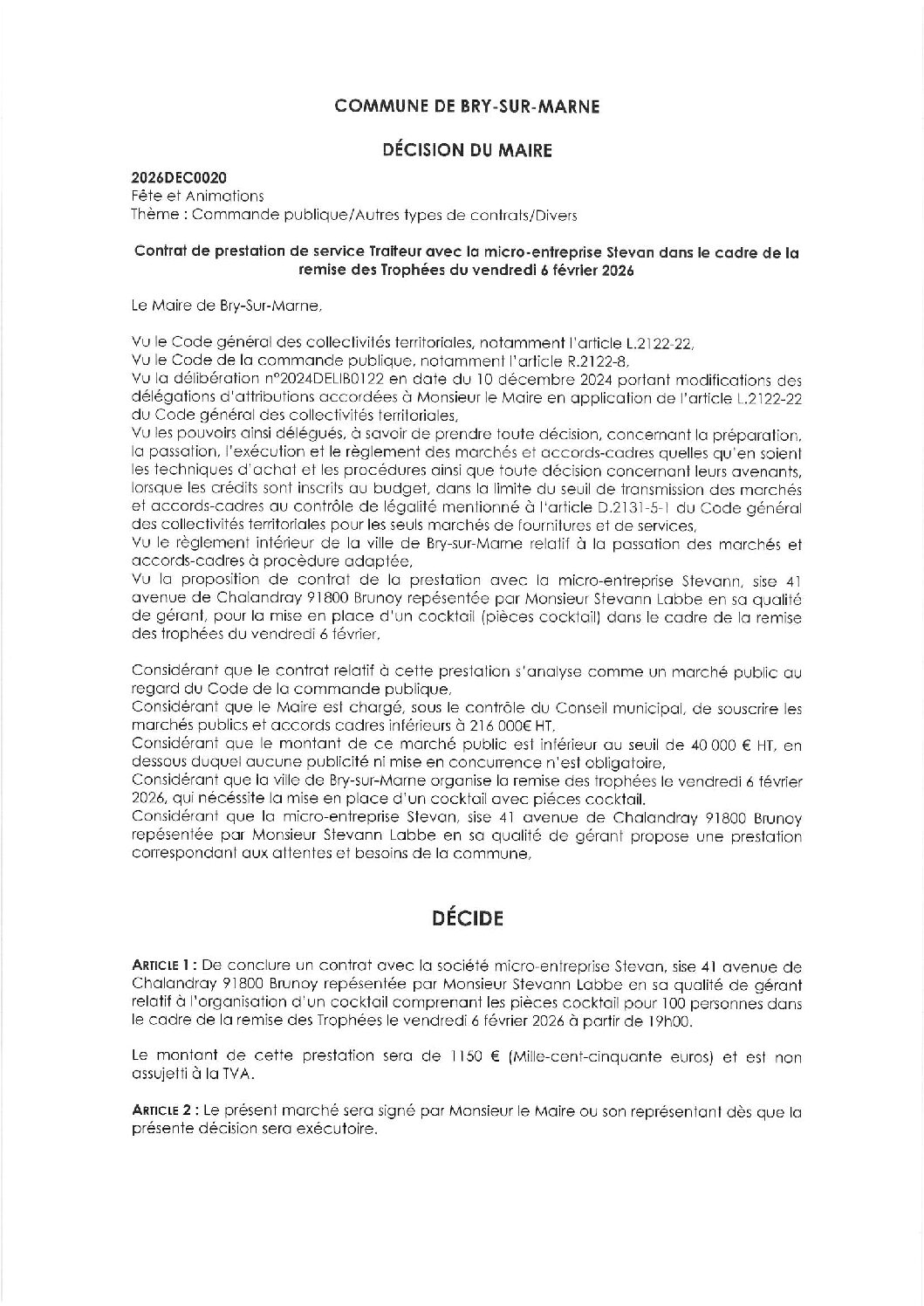 2026DEC0020 – Contrat de prestation de service Traiteur avec la micro-entreprise Stevan dans le cadre de la remise des Trophées du vendredi 6 février 2026