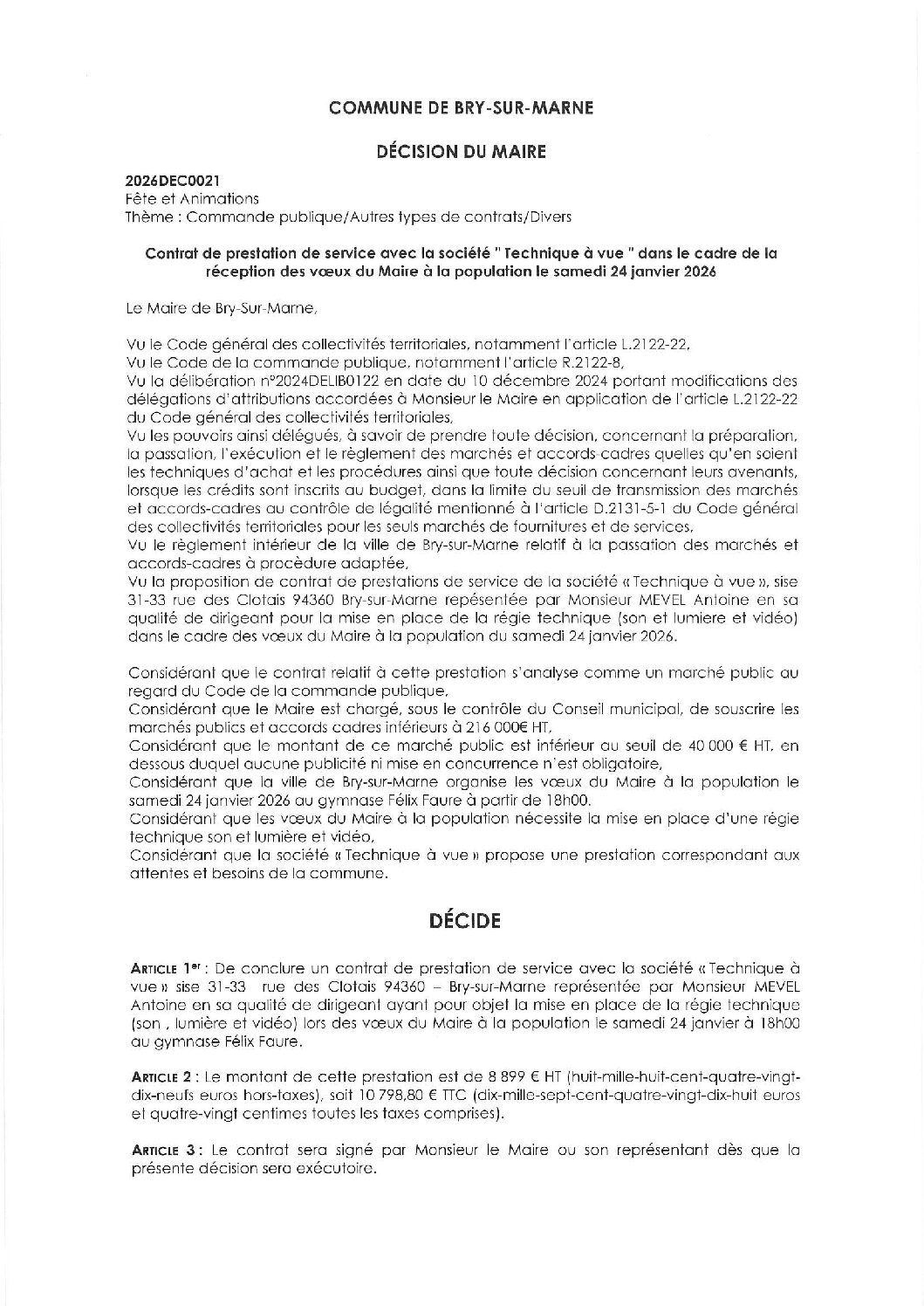 2026DEC0021 – Contrat de prestation de service avec la société " Technique à vue " dans le cadre de la réception des vœux du Maire à la population le samedi 24 janvier 2026