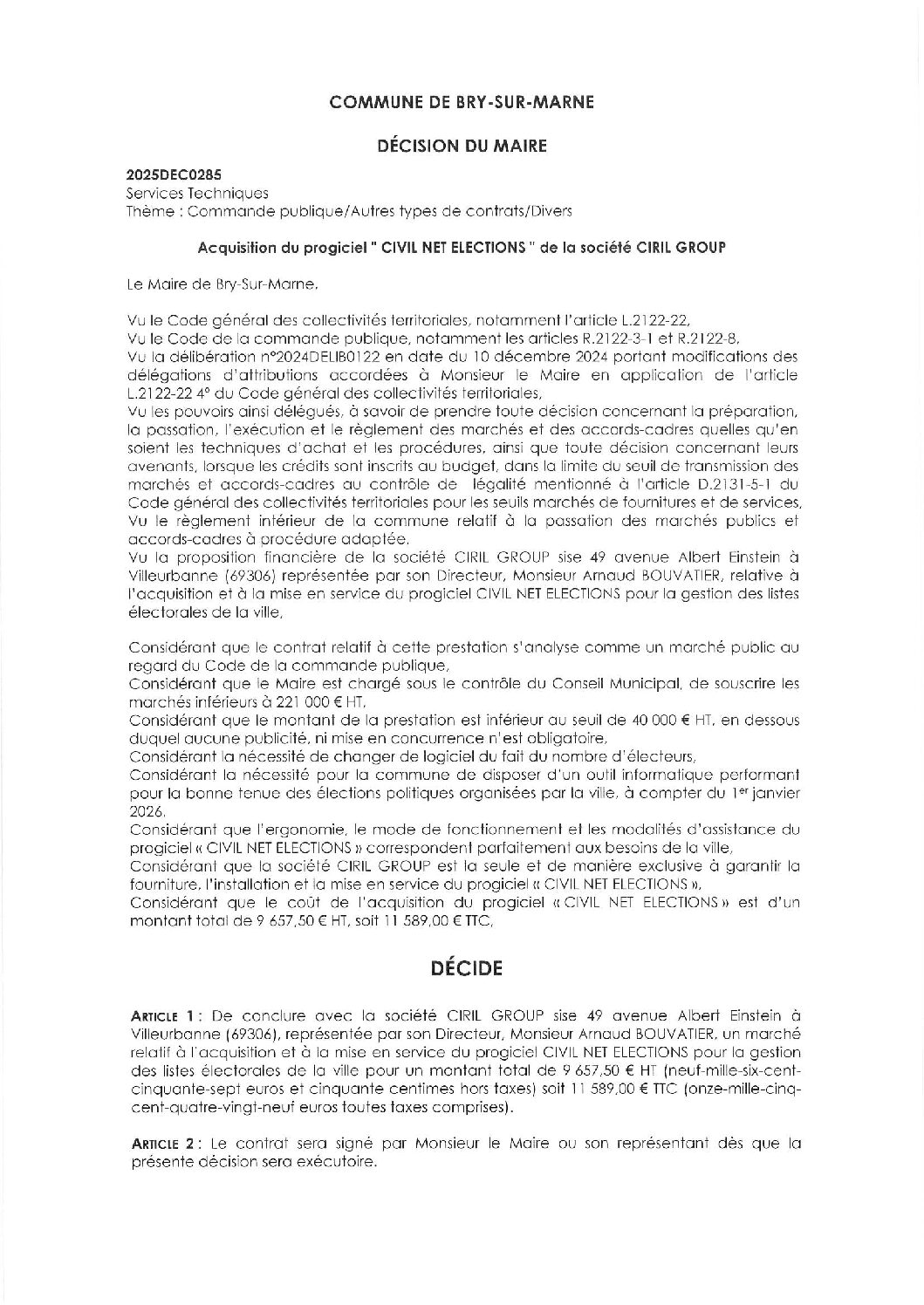 2025DEC0285 – Acquisition du progiciel CIVIL NET ELECTIONS de la société CIRIL GROUP