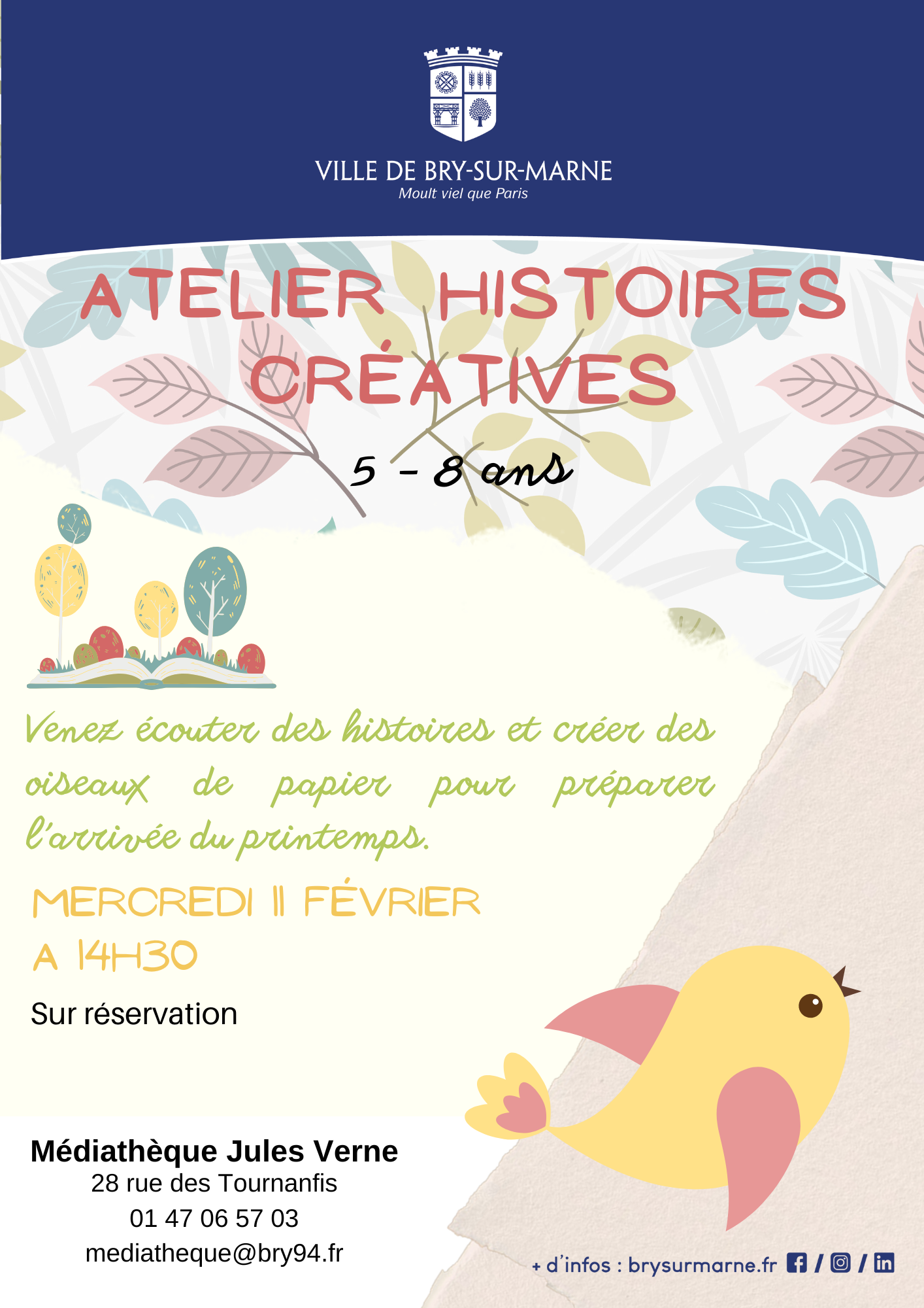 Horaire : 14h30Lieu : médiathèque Jules VerneTarif : gratuit sur réservationInfos et réservations : à mediatheque@bry94.fr ou au 01 47 06 57 03