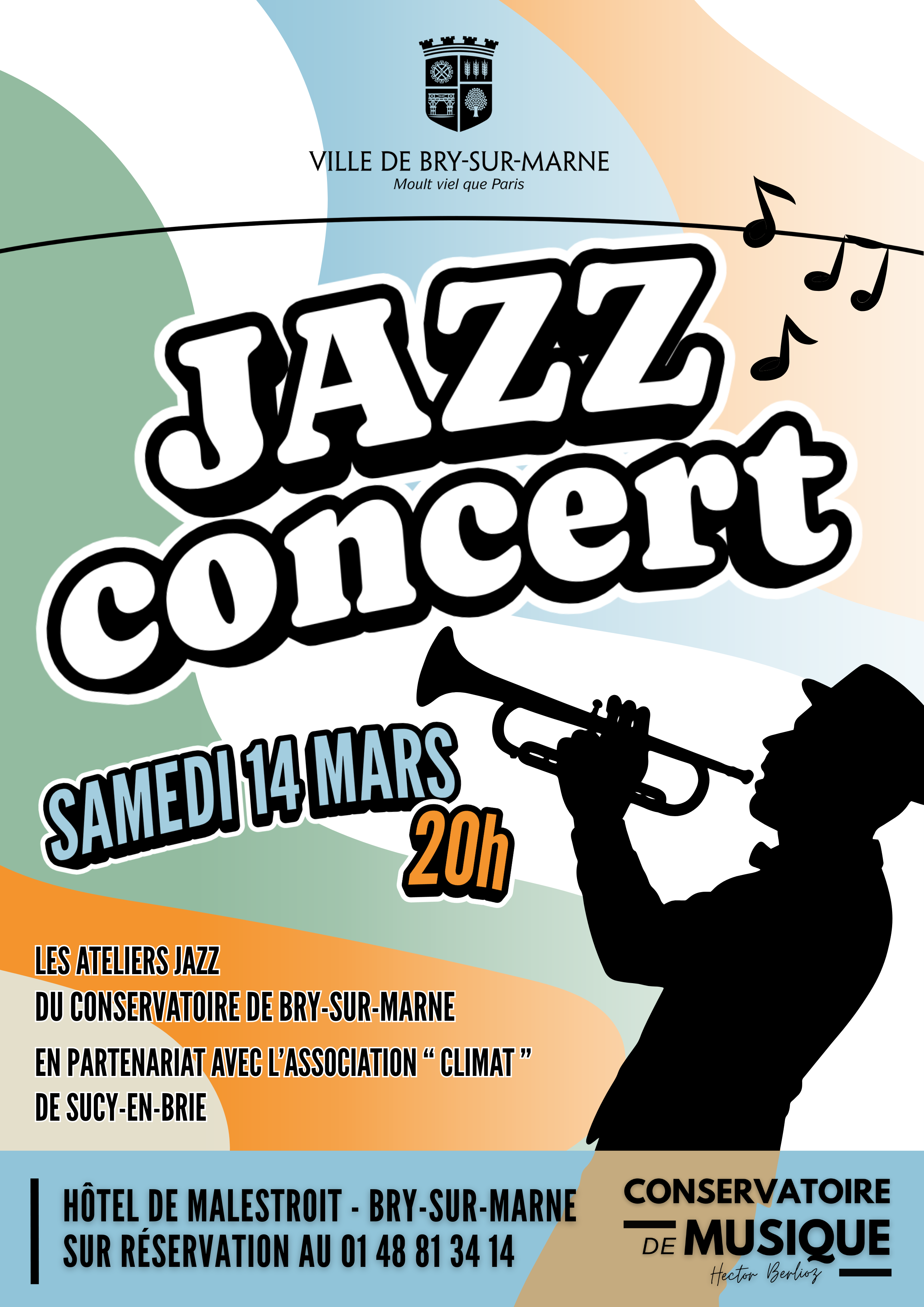 Comme chaque année, le conservatoire vous propose un concert des Ateliers Jazz et invite l’association « Climats » de Sucy-en-Brie à se joindre à eux. Saxophones, trompettes, basse ou guitare …. vous feront vibrer en interprétant les plus grands standards de jazz. N’hésitez plus et réservez vos places !