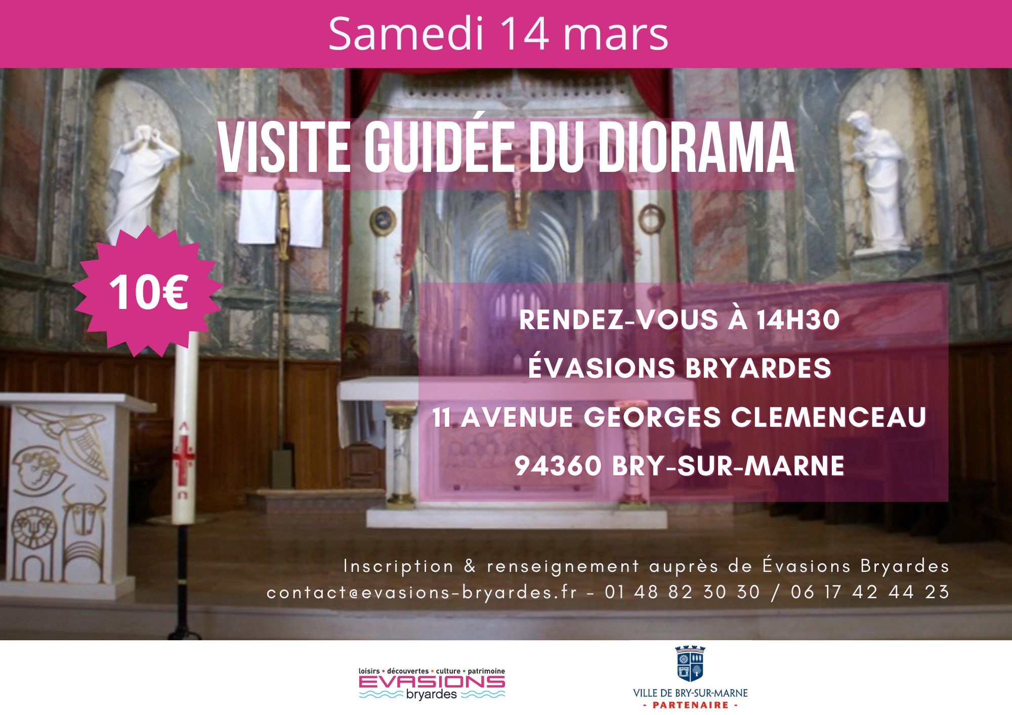 Horaire : 14h30 Lieu : rendez-vous au 11 avenue Georges Clemenceau à Bry-sur-Marne Tarif : 10 € Réservations : sur place au 11 avenue Georges Clemenceau ou par téléphone au 01 48 82 30 30 ou au 06 17 42 44 23