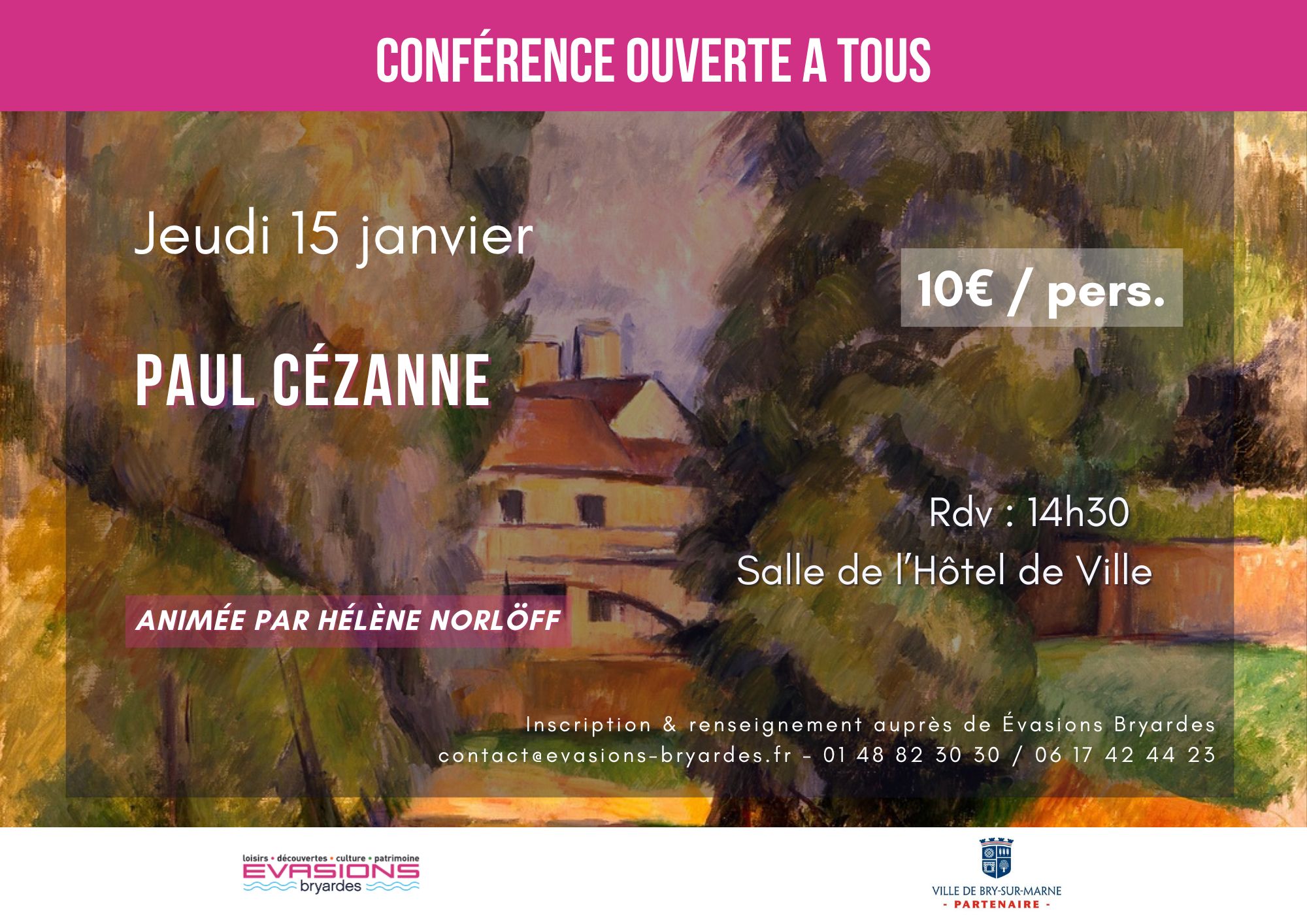Horaire : 14h30 Lieu : salle de l’Hôtel de Ville de Bry Tarif : 10 € Infos et réservations : sur place au 11 avenue Georges Clemenceau ou par téléphone au 01 48 82 30 30 ou au 06 17 42 44 23