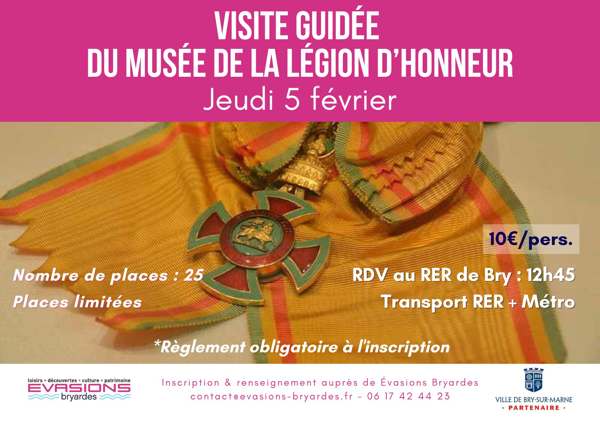 Horaire : départ du RER A de Bry-sur-Marne à 12h45 Lieu : musée de la Légion d’honneur, Paris 7e Transport : RER + Métro Tarif : 10 € par personne Infos et réservations : sur place au 11 avenue Georges Clemenceau ou par téléphone au 01 48 82 30 30 ou au 06 17 42 44 23