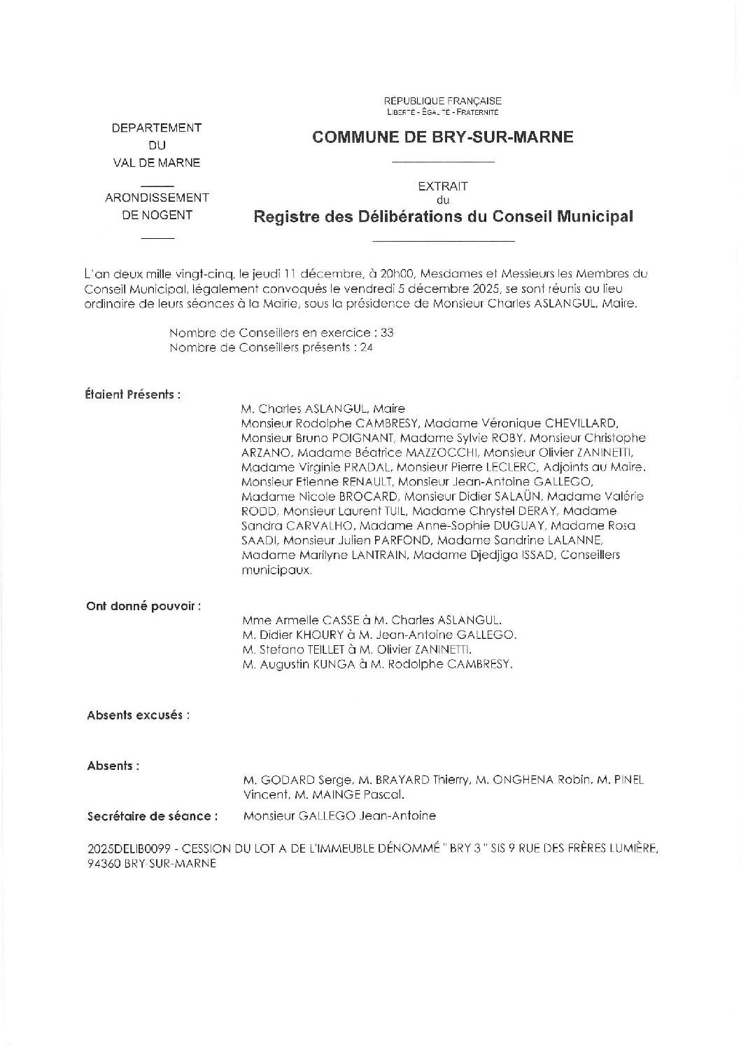 CM du 11 décembre 2025-2025DELIB0099 Cession du lot A de l'immeuble dénommé BRY 3 sis 9 rue des Frères Lumière 94360 BRY-SUR-MARNE